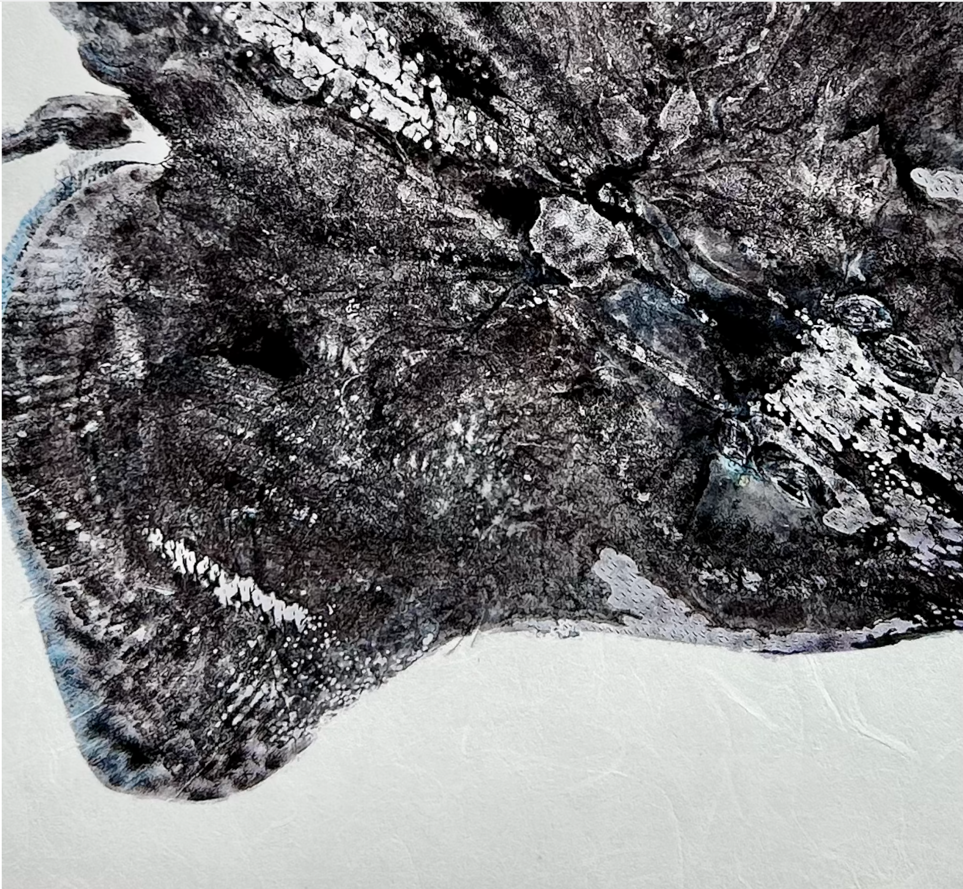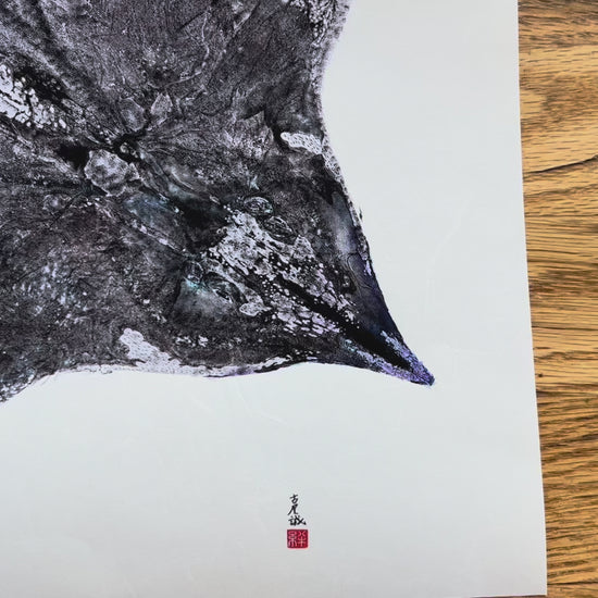 The skate was gifted to me by Big Fish Lab, and it was originally printed with sumi ink and archival oil. I still remember first time seeing this skate up close and being fascinated by its thorn denticles and its purple color near the nose. Other colors were added (somewhat accidentally) from previous prints that I did in Prussian blue and I leaned into it.