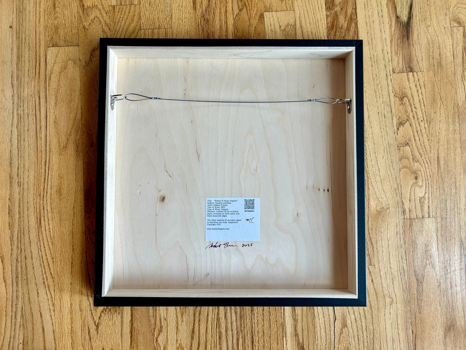Mounted on an 18" x 18" birch panel with black lacqured edges. Hanging hardware is already installed.